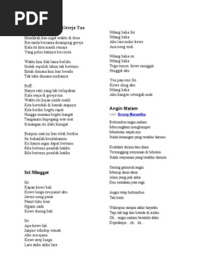 (*) c f c waktu kini t'lah lama berlalu f g c sudah sepuluh tahun tak bertemu f entah di mana kini kau berada c g. Back | video and audio performances by our users (0). Play along with guitar, ukulele, or piano with interactive chords and diagrams. intro c f g c am c g c f c f verse 1 c f c masihkah kau ingat waktu di desa f g c bercanda bersama di samping gereja c f kala itu kita masih remaja c g. Lirik lagu gereja tua panbers.